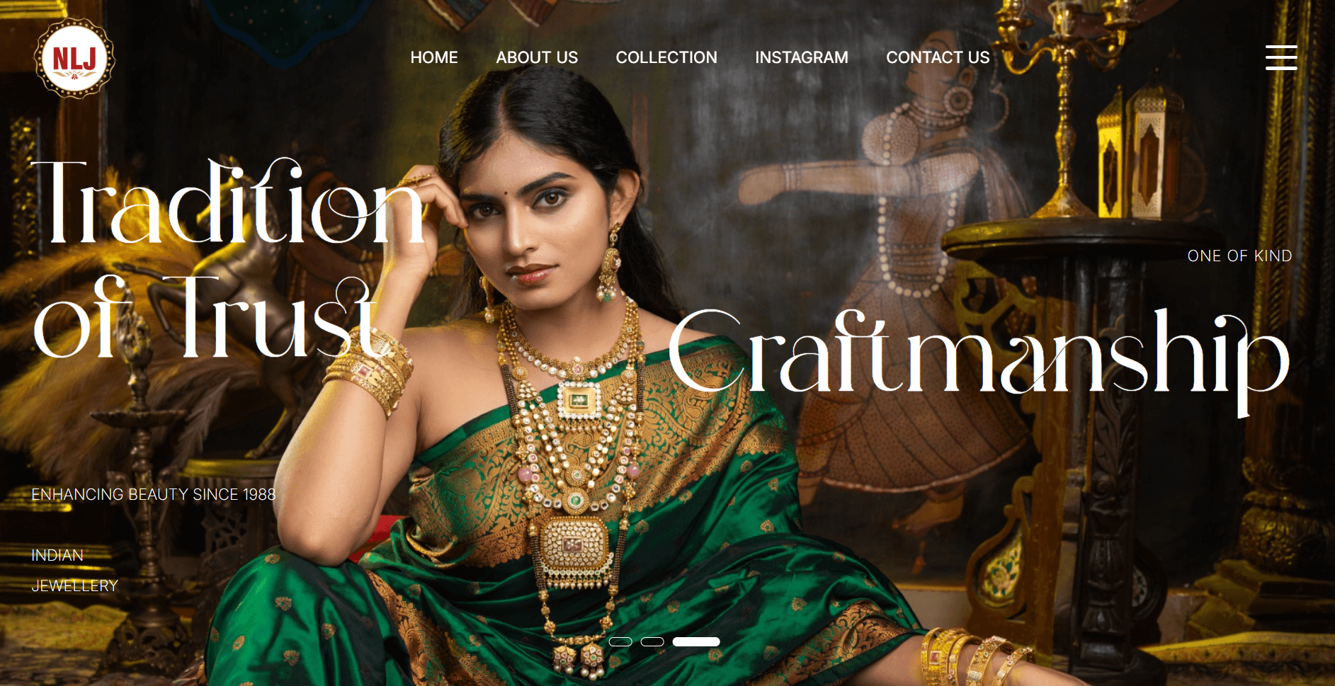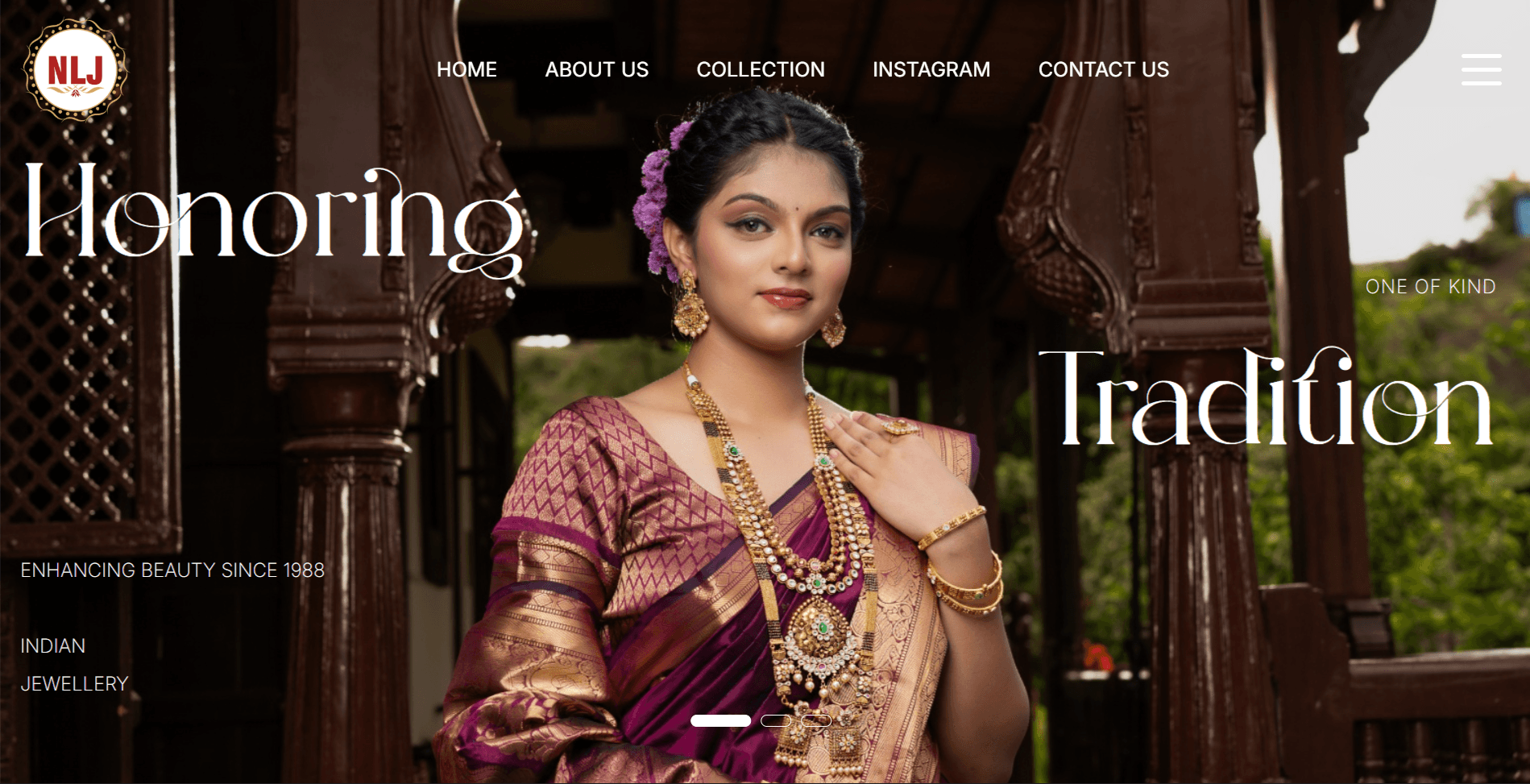 The site was built on WordPress with a fully custom design — warm gold and ivory palette, cinematic hero section with rotating headlines, and a gallery section pulling directly from their Instagram. Navigation was kept intentionally minimal — Home, About, Collection, Contact — because the jewellery is the hero, not the UI. The result is a site that feels like walking into a premium showroom.